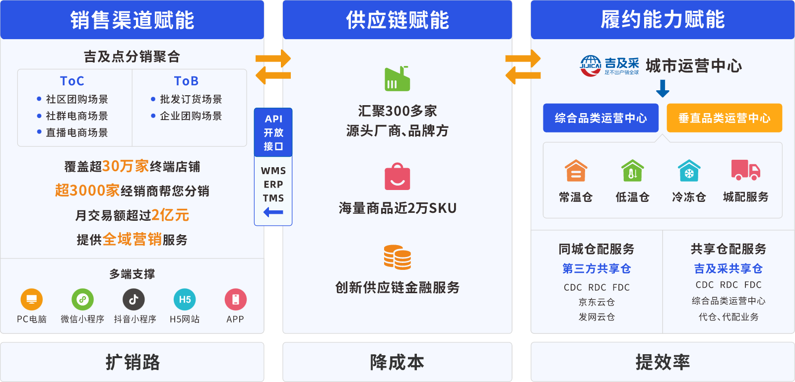 入驻供应商可实现商品一键上传,一键分销,商品分层定价,全渠道分销触达,上万家分销商即刻同步商品信息,订单自动回传,发货信息实时同步,吉及采城市运营中心为厂商、品牌商快速构建同城仓配体系,实现供应链协同运作,高效管理,快捷服务,全面触达。